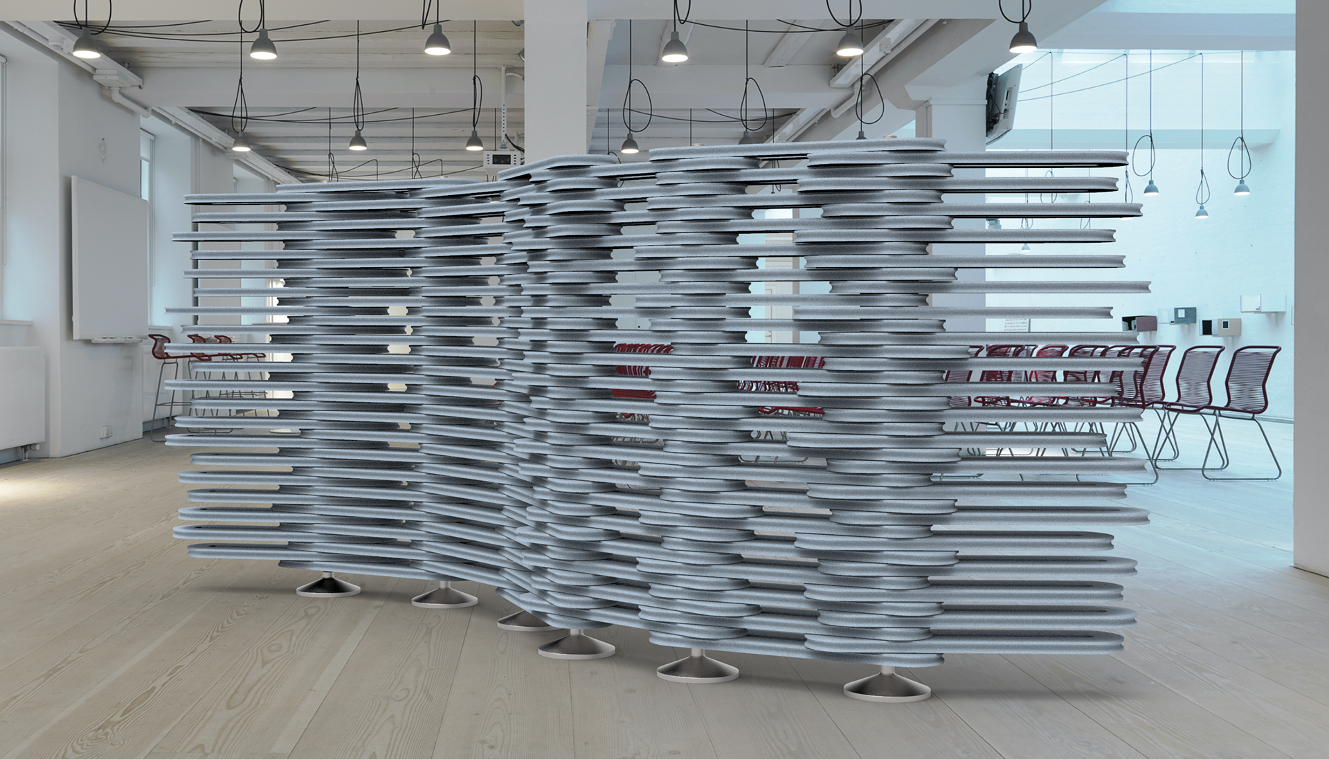 This product helps create an improved work environment by reducing acoustic and visual noise in open-plan offices. The screen is a flexible sound-absorbing room divider made of felt that offers an easily adjustable shape that provides a visual and acoustic shielding.